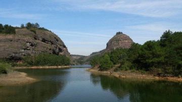 景区内丹霞山体连绵起伏,纵横交错,沟壑积水连连不断,湖水环绕山壁,山骨蜿蜒水中,有九十九道湾,三十六重天之特色,人称“水上迷宫”。