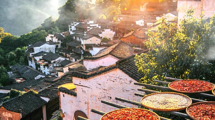 挂在山崖上的篁岭古村,地无三尺平,数百年来,村民早已习惯用平和的心态与崎岖的地形“交流”,绘就出了一处“晒秋人家”风情画。